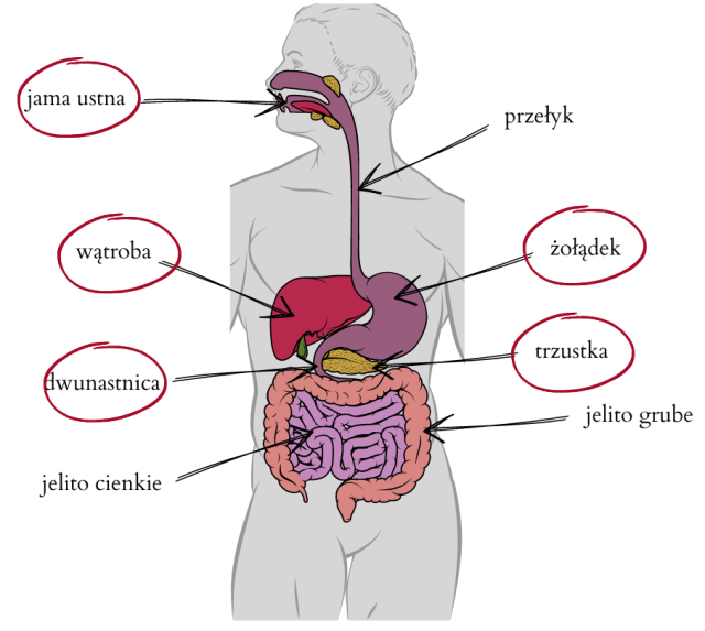 Podkreślone na czerwono narządy wydzielają specjalne białka - enzymy, które biorą udział w reakcjach chemicznych, umożliwiając ich przebieg, jednak same nie są w nich zużywane. W przypadku enzymów wydzielanych przez narządy układu pokarmowego, mają one funkcję rozkładu substancji pokarmowych złożonych na prostsze, które będą mogły przedostać się do komórek ciała. Narządy, które wydzielają enzymy to gruczoły.