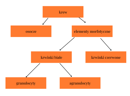 Krew składa się z osocza oraz elementów morfotycznych krwi (krwinek i płytek krwi). Wśród krwinek wyróżniamy krwinki białe (leukocyty), krwinki czerwone (erytrocyty). Krwinki czerwone odpowiedzialne są za transport tlenu przyłączonego do hemoglobiny.Krwinki białe to leukocyty, dzielące się na granulocyty unieszkodliwiające patogeny i agranulocyty (bez ziarnistości):limfocyty i monocyty. W skład krwi idą płytki krwi, które biorą udział w procesie krzepnięcia krwi.