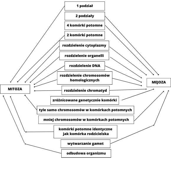 Mitoza i mejoza są to dwa typy podziałów komórkowych. W procesie mitozy otrzymujemy dwie identyczne komórki potomne, które produkowane są z jednej komórki macierzystej. W przypadku mejozy powstają aż 4 komórki potomne z jednej komórki macierzystej – mają one jednak zredukowaną liczbę chromosomów. W związku z tym w mitozie dochodzi do jednego podziału, natomiast w mejozie do dwóch podziałów.