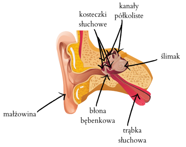 Kosteczki słuchowe odpowiadają za przekazywanie drgań do ucha wewnętrznego, kanały półkoliste są narządem równowagi, nerw słuchowy odpowiada za przekazywanie informacji o dźwięku do mózgu, ślimak zawiera receptory słuchu, małżowina uszna odpowiada za zbieranie dźwięków z otoczenia, błona bębenkowa odpowiada za przekazywanie drgań na kosteczki słuchowe, natomiast trąbka słuchowa służy do wyrównywania ciśnień po dwóch stronach błony bębenkowej.