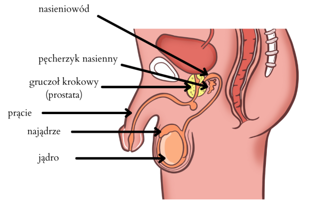 Kolejność: 1. jądro, 2. najądrze, 3. nasieniowód, 4. gruczoł krokowy (prostata), 5. pęcherzyk nasienny, 6. prącie
