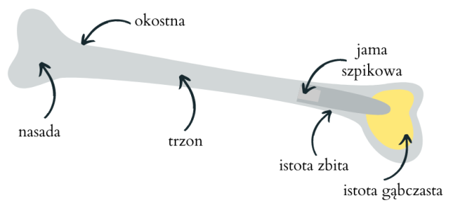 Tkanka gąbczasta luźna zbudowana jest z beleczek kostnych, między którymi znajdują się wolne przestrzenie. Dzięki niej kość jest lekka i odporna na odkształcenia. Środkowa część kości nazywana jest trzonem. Na końcach trzonu znajdują się dwie nasady. Trzon zbudowany jest z tkanki kostnej zbitej, która chroni jamę szpikową, czyli wewnętrzny kanał kości. Jama szpikowa wypełniona jest szpikiem kostnym. Budowa tkanki kostnej zbitej jest zwarta, natomiast struktura tkanki kostnej gąbczastej jest luźna.