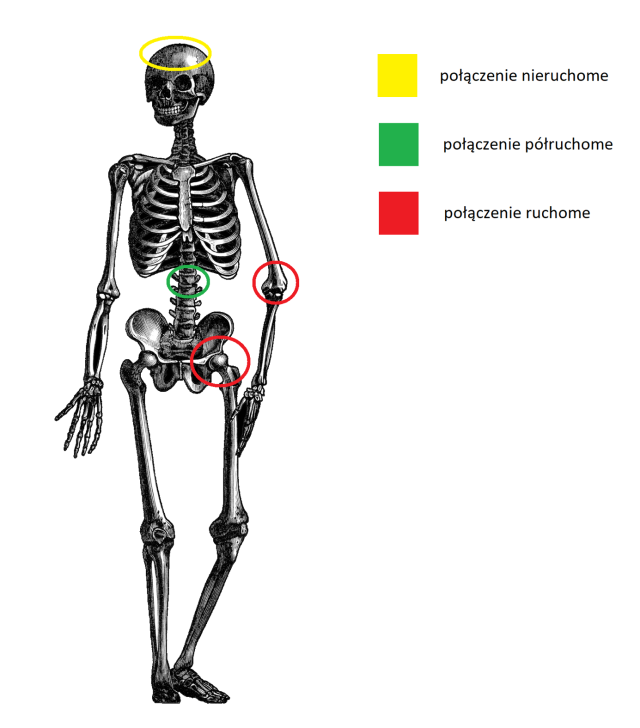 Szwy łączące płaskie kości czaszki stanowią połączenie nieruchome. W przypadku połączeń nieruchomych szwy, które zbudowane są z włókien tkanki łącznej, wnikają do sąsiadujących ze sobą kości i silnie je ze sobą spajają. Połączeniem półruchomym łączą się m.in. kręgi. W przypadku połączeń ruchomych występuje jama stawowa, która jest wypełniona mazistym płynem ułatwiającym ruchy kości względem siebie. Przykładami stawu ruchomego są m.in. staw biodrowy i staw łokciowy.