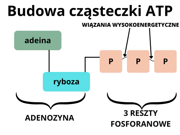 ATP, czyli adenozynotrifosforan, zbudowany jest z adeniny, rybozy oraz trzech reszt fosforanowych V. Wiązania pomiędzy resztami fosforanowymi V to wiązania wysokoenergetyczne więc ich rozłam będzie uwalniał energię, której źródłem ma być ATP.