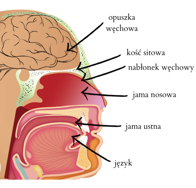Opuszka węchowa odpowiada za rozpoznawanie zapachów, kość sitowa wytwarza oczodoły i jamę nosową, komórki nerwowe odpowiadają za przesyłanie impulsów nerwowych, jama nosowa odpowiada za oczyszczanie powietrza z zanieczyszczeń i drobnoustrojów chorobotwórczych oraz odpowiada za odbieranie zapachów, jama ustna odpowiada za przyjmowanie oraz trawienie pokarmów, natomiast język odpowiada za odczuwanie smaków.