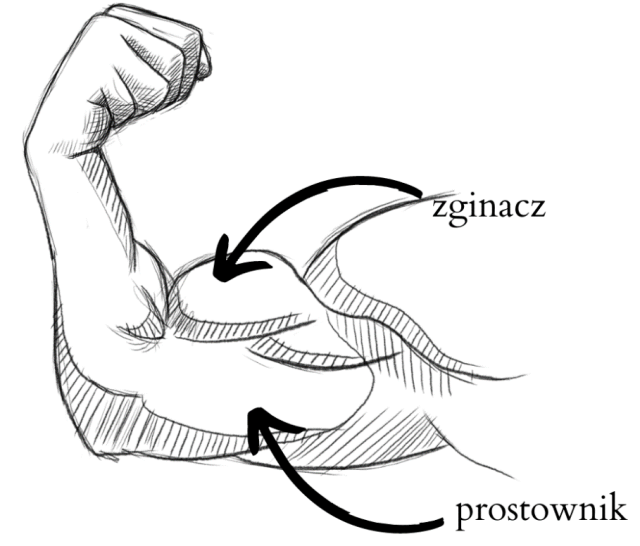 Do zginania kończyny potrzeba pary mięśni antagonistycznych. W momencie skurczu mięśnia zginacza kończyna górna zgina się w stawie łokciowym. W tym czasie mięsień prostownik zostaje rozciągnięty. Natomiast gdy kurczy się, prostownik kończyna prostuje się w stawie, a równocześnie zginacz rozluźnia się i zostaje rozciągnięty.