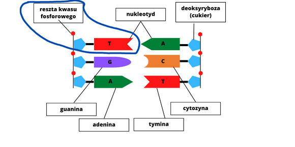 Na rysunku przedstawiona została cząsteczka DNA składająca się z dwóch komplementarnych nici. Każda nić zawiera 3 nukleotydy. Każdy nukleotyd składa się z reszty kwasu fosforowego, deoksyrybozy oraz jednej z 4 zasad azotowych: adeniny, tyminy, cytozyny lub guaniny. Oznaczenia zasad azotowych biorą się od pierwszych liter ich nazw.