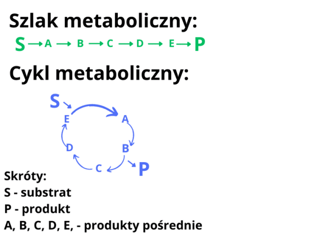 Zwróć uwagę, że nazwy wskazują na to, czym dane sformułowanie jest. Szlak biegnie w jedną stronę i prowadzi do jakiegoś celu, więc szlaki metaboliczne biegną kierunkowo w jedną stronie. Natomiast cykl to coś, co biegnie „na okrągło”, więc w przypadku cykli produkt będzie substratem tego cyklu, a on będzie zataczał krąg.