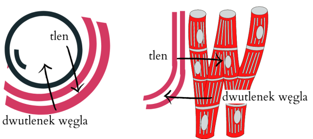 Do naczynia włosowatego: dwutlenek węgla, woda, zbędne produkty przemiany materii