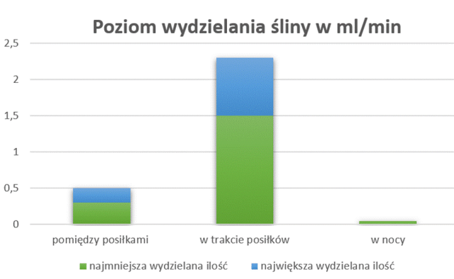 Najwięcej śliny wydzielamy w trakcie posiłków, ponieważ zawiera ona enzym, który wspomaga wstępne trawienie oraz rozdrabnianie pokarmu. Najmniej silny wydzielamy w nocy, ponieważ nie jest ona nam wtedy potrzebna – w trakcie snu nie spożywamy pokarmu.