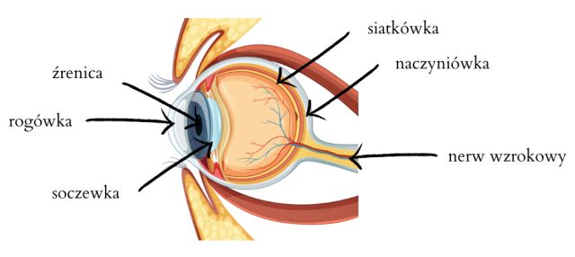 Źrenica reguluje docieranie ilości światła do wnętrza oka, rogówka odpowiada za kierowanie i wnikanie promieni świetlnych do oka, soczewka jest odpowiedzialna za skupianie i załamywanie promieni świetlnych, siatkówka zawiera fotoreceptory takie jak czopki i pręciki, naczyniówka odpowiada za odżywienie i dotlenienie oka, natomiast nerw wzrokowy odpowiada za przekazywanie informacji do mózgu.