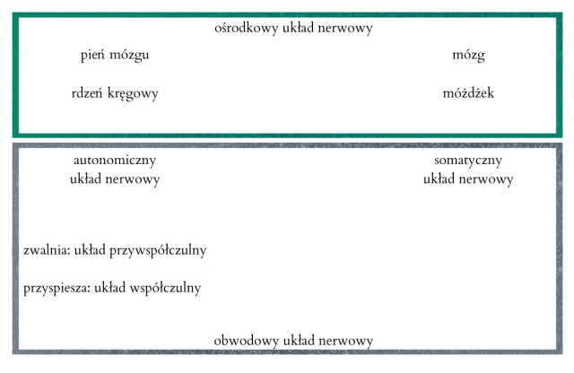 Układ nerwowy dzieli się na układ ośrodkowy i obwodowy, każdy z nich posiada charakterystyczne elementy. Ośrodkowy układ nerwowy jest centralnym układem nerwowym, zbudowanym z istoty szarej i białej. Obwodowy układ nerwowy odpowiada za przekazywanie informacji pomiędzy ośrodkowym układem nerwowym a narządami w organizmie. Układ somatyczny, którego zadaniem jest kontakt ze środowiskiem zewnętrznym. Układ przywspółczulny należy do autonomicznego układu nerwowego i odpowiada za odpoczynek organizmu. Układ współczulny należy do autonomicznego układu nerwowego i odpowiada za mobilizację organizmu do walki. Rdzeń kręgowy należy do ośrodkowego układu nerwowego i odpowiada za koordynację ruchów. Pień mózgu należy do ośrodkowego układu nerwowego i odpowiada za podtrzymywanie czynności życiowych - oddychania, termoregulacji. Móżdżek należy do tyłomózgowia i odpowiada za ruch, równowagę i zdolności motoryczne.