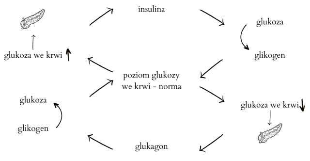Insulina i glukagon działają antagonistycznie. Insulina obniża poziom glukozy we krwi, natomiast glukagon zwiększa stężenie glukozy we krwi.