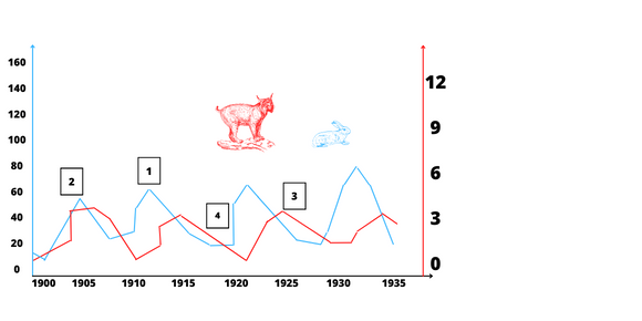 2. Gdy liczba ofiar wzrasta, następuje spadek / wzrost liczby drapieżników, ponieważ mają pod dostatkiem pożywienia.