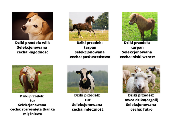 W tym ćwiczeniu przedstawione zostały zwierzęta, które powstały w wyniku doboru sztucznego. Pod każdym zdjęciem napisz jego dzikiego przodka oraz jaka była jego selekcjonowana cecha. W razie potrzeby możesz skorzystać z informacji w dostępnych źródłach wiedzy. W opisie selekcjonowanych cech możesz wykorzystać wyrazy, które znajdują się w ramce w tym ćwiczeniu.