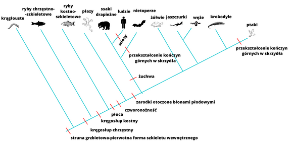 Przedstawione w ten sposób drzewo rodowe kręgowców nazywamy kladogramem kręgowców. Kladogram jest to diagram, który kształtem przypomina drzewa filogenetyczne, jednak nie uwzględnia on czasu pojawiania się nowych cech ewolucyjnych.