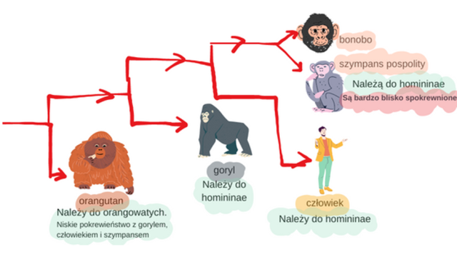 Człowiek przejawia największe pokrewieństwo z szympansem pospolitym, gdyż dzielili razem wspólnego przodka. Orangutany oraz goryle również dzieliły razem wspólnego przodka.