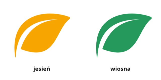 Zastanów się, jaki kolor liście mają wiosną, a jaki jesienią. Pokoloruj liście na odpowiednie kolory.