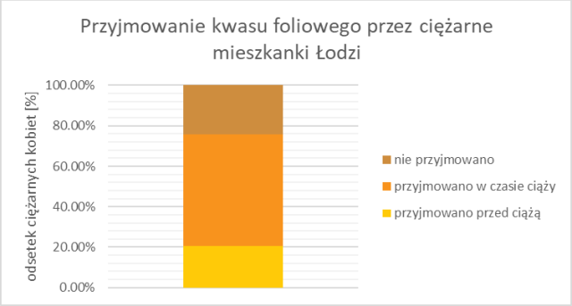 Na początku zaznacz lub przepisz wartości, o które proszą w poleceniu – procent kobiet ciężarnych przyjmujących kwas foliowy przed ciążą, w czasie ciąży albo niezażywających kwasu foliowego – kolejno 20,72%, 54,95% i 24,32%. Następnie narysuj osie poziomą i pionową oraz słupek w taki sposób, by wysokość słupka była równa 100% (udział procentowy znajduje się na osi pionowej – zaznacz wartości 0-100% co 10% w równych odstępach). Narysuj w słupku poziome linie o wartościach wybranych z tabeli. Dodaj legendę, tytuł wykresu i osi pionowej.