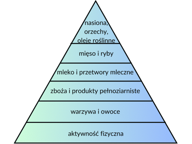 W tym zadaniu narysuj w zeszycie 6-stopniową piramidę zdrowego żywienia. Na odpowiednich szczeblach tej piramidy wpisz pojęcia podane w zadaniu.