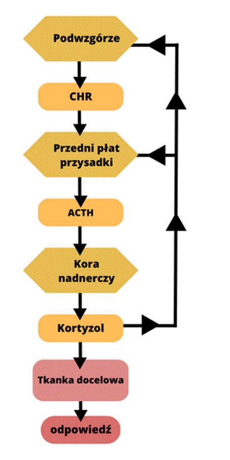 Mechanizm sprzężenia zwrotnego ujemnego to mechanizm działające na zasadzie pętli, która się samoreguluje. Uwalnianie kortyzolu, które jest następstwem działania tego mechanizmu, powoduje, że podwzgórze i przysadka zaczyna wyhamowywać, dzięki czemu wytwarzanie kortyzolu jest zahamowywane w odpowiednim momencie.