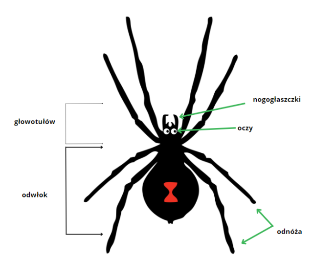 Popatrz uważnie na obrazek pajęczaka. Zastanów się, z jakich elementów składa się jego ciało i podpisz odpowiednie nazwy obok klamr oraz linii.