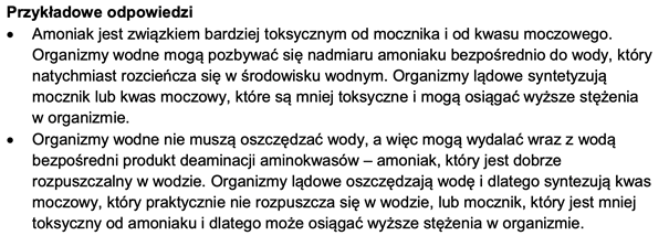 · Amoniak jest związkiem bardzo toksycznym, dlatego musi być szybko usuwany z organizmu. Jest dobrze rozpuszczalny w wodzie i może być wydalany bezpośrednio, ale wymaga dużej ilości wody. Z tego powodu amoniak wydalają głównie zwierzęta wodne, takie jak ryby i larwy płazów.