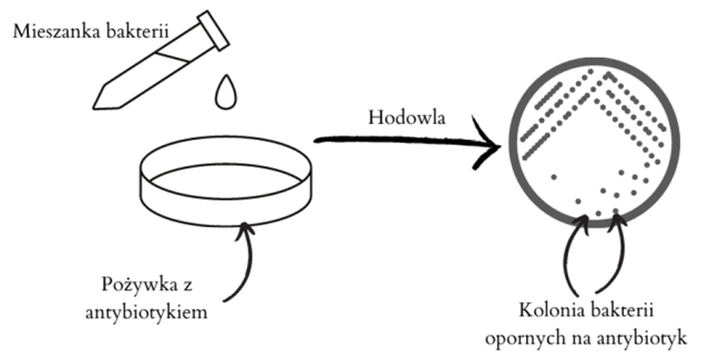 Mieszanka bakterii wysiewana jest na podłoże z antybiotykiem – powoduje on śmierć wszystkich nieopornych bakterii. Pozostają bakterie oporne na antybiotyk i one ulegną podziałom, tworząc kolonię.
