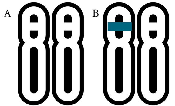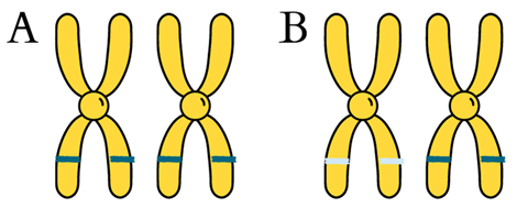 biwalent – inaczej tetrada, para chromosomów homologicznych połączonych chiazmami (homozygota – schemat A, heterozygota – schemat B)