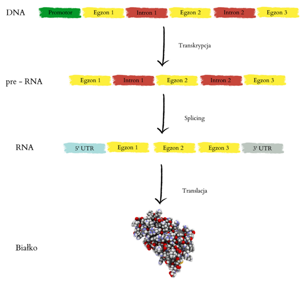 Przypomnij sobie, jakie procesy zachodzą od informacji genetycznej zawartej w DNA do powstania białka. Informacja genetyczna z DNA ulega transkrypcji i powstaje pre – mRNA. Składa się ono z egzonów (sekwencje kodujące) poprzecinanych intronami (sekwencje niekodujące). W procesie splicingu zostają wycięte introny, dzięki czemu tworzy się mRNA. Z mRNA w procesie translacji powstają białka.