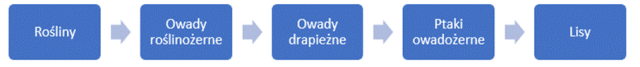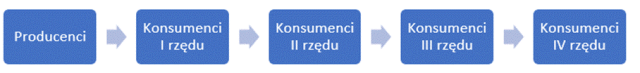 Rośliny są producentami, gdyż przekształcają materię nieorganiczną w organiczną. Należą do I poziomu w łańcuchu troficznym. Poziomem II łańcucha troficznego określamy roślinożerców, którzy są konsumentami I rzędu- odżywiają się producentami. Konsumenci II rzędu to organizmy odżywiające się gatunkami roślinożernymi. Jest to III poziom łańcucha pokarmowego. Konsumenci III rzędu odżywiają się gatunkami z III poziomu troficznego, co jest IV poziomem troficznym. Ostatecznie organizmami z IV poziomu troficznego odżywiają się konsumenci IV rzędu- najczęściej ostateczni drapieżnicy w danym ekosystemie.