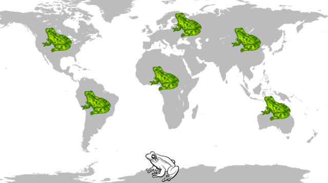 W tym zadaniu musisz zamalować na mapie żaby znajdujące się na kontynentach, na których występują płazy.
