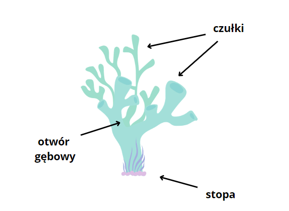 Zastanów się, jak zbudowany jest polip. Zaznacz strzałkami odpowiednie części. Najłatwiej będzie zacząć od otworu gębowego i czułek.