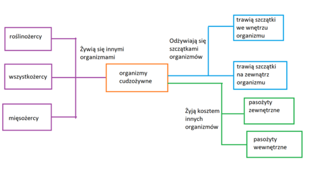 Roślinożercy żywią się głównie roślinami. Mięsożercy żywią się innymi organizmami, bardzo często roślinożercami. Wszystkożercy mogą zarówno jeść rośliny, jak i mięso. Niedźwiedzie to wszystkożercy. Organizmy żywiące się szczątkami innych nazywamy padlinożercami (na przykład sępy, hieny). Pasożyty szkodzą organizmowi, który wykorzystują. Rośliny też mogą być pasożytami.