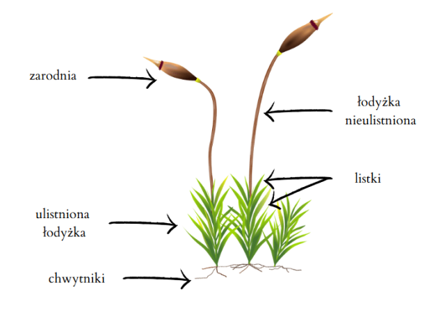 Płonnik pospolity to typowy przykład mchu posiadający organy charakterystyczne dla tej grupy organizmów.