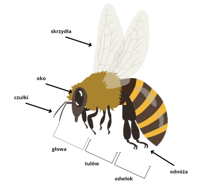 Zastanów się, jak nazywają się wskazane strzałkami elementy budowy pszczoły.