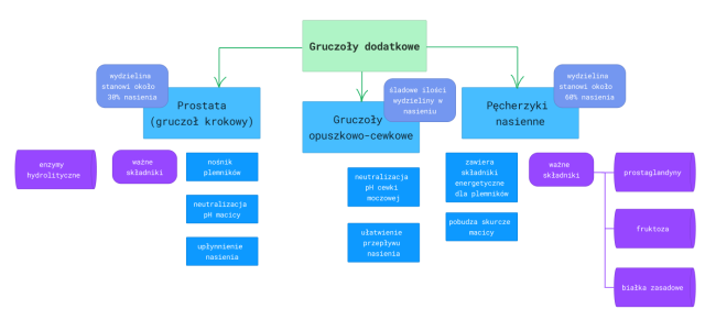 § Pęcherzyki nasienne produkują i magazynują wydzielinę zawierającą składniki odżywcze dla plemników, takie jak fruktoza – monosacharyd, będący ważnym źródłem energii. Poprzez zawartość białek zasadowych, wydzielina ta neutralizuje kwaśny odczyn pochwy, co chroni plemniki i umożliwia utrzymanie ich zdolności ruchu. Wydzielina pęcherzyków nasiennych zawiera również prostaglandyny – grupę hormonów, regulujący różnorodne procesy fizjologiczne. Dzięki obecności prostaglandyn w płynie nasiennym nasienie może wywołać skurcze mięśni macicy, co ułatwia ruch plemników w kierunku jajowodów i zapewnia im większe szanse na dotarcie do komórki jajowej w celu zapłodnienia.
