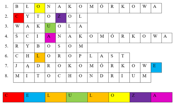 Jądro komórkowe zawiera informację genetyczną, czyli DNA. W mitochondriach produkowana jest energia. Wakuole (wodniczki) magazynują wodę i sole mineralne. Rola błony komórkowej to oddzielenie komórki od środowiska zewnętrznego. Pomaga w wymianie informacji między komórką a światem zewnętrznym. Chloroplasty są odpowiedzialne za proces fotosyntezy. Ściana komórkowa chroni przed mechanicznymi urazami wnętrze komórki.