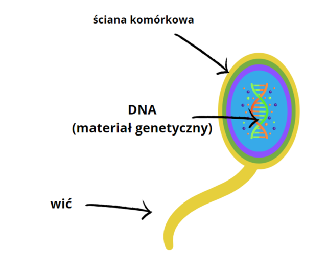 Dzięki wici bakteria może się poruszać. Ściana komórkowa nadaje kształt i chroni przed mechanicznymi uszkodzeniami. DNA – kwas dezoksyrybonukleinowy – nośnik informacji genetycznej.