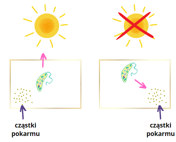 Zastanów się, w jaki sposób euglena zapewnia sobie substancje odżywcze i na tej podstawie pomyśl, w którą stronę będzie się ona poruszać. Zaznacz odpowiedni kierunek strzałką.