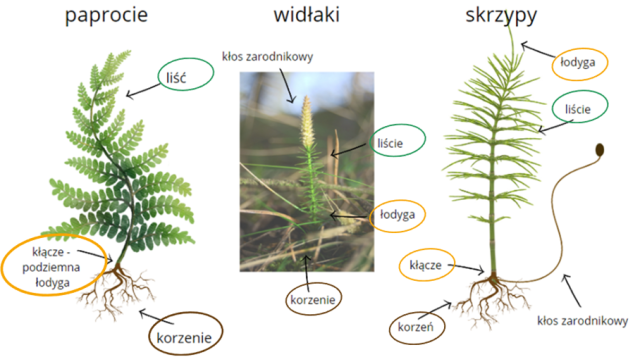 Zauważ, że wszystkie trzy grupy mają liście i korzenie, a różnią się budową łodygi i kłącza. Paprocie mają kłącze, czyli podziemną łodygę, widłaki nie mają kłącza, a skrzypy mają widocznie oddzielone kłącze (część podziemną) i łodygę (część nadziemną) .
