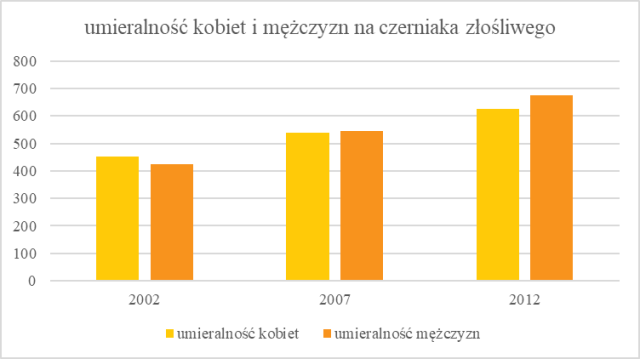 Skonstruowanie wykresu kolumnowego pozwala na wizualne porównanie danych i ukazanie ewentualnych zmian w czasie. By skonstruować taki wykres kolumnowy, odszukaj w tabeli wartości liczbowe umieralności kobiet i mężczyzn w latach 2002, 2007 i 2012, a następnie utwórz słupki odpowiednio według dat i płci – poprzez umieszczenie danych na osi X (lata) oraz osi Y (liczba zgonów) dla każdej płci.