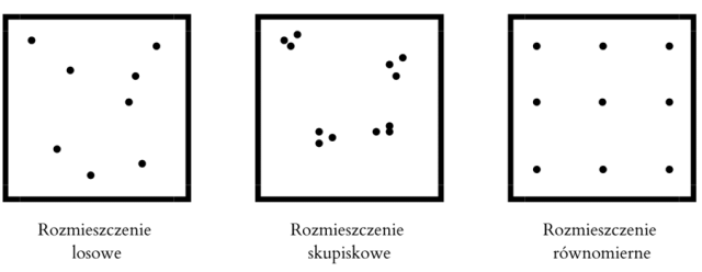 Rozmieszczenie gatunków dzieli się na: równomierne, skupiskowe i losowe. W rozmieszczeniu równomiernym odległości między osobnikami są jednakowe. Taki typ rozmieszczenia występuje na przykład wśród roślin uprawnych lub zwierząt kolonijnych w okresie lęgowym. W rozmieszczeniu skupiskowym osobniki zebrane są w grupach. Przykładem mogą tu być gatunki zwierząt tworzących stada lub gatunki ryb tworzących ławice. Ostatnim typem rozmieszczenia jest rozmieszczenie losowe, w którym układ osobników jest przypadkowy. Przykładem mogą być tu gatunki roślin, których nasiona są rozsiewane przez wiatr.
