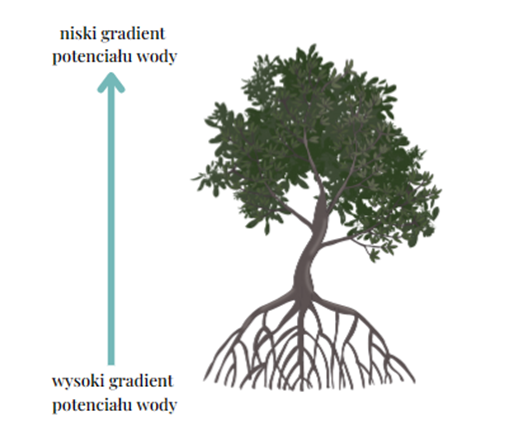 Potencjał wody określa zdolność komórki do pobierania lub oddawania wody w procesie osmozy. Rozpuszczenie substancji w wodzie wywołuje spadek jej potencjału. Potencjał wody jest również uzależniony od ciśnienia hydrostatycznego i osmotycznego. Jest on ważny, ponieważ wyznacza kierunek przemieszania się wody z obszarów o wyższym potencjale, do obszarów o niższym. Korzenie mają wyższy potencjał wody niż łodyga i liście, a z kolei one wyższe niż atmosfera. Dlatego strzałka ma grot skierowany w górę.
