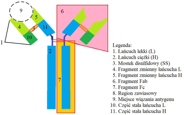 Przeciwciało zbudowane jest z dwóch łańcuchów lekkich oraz dwóch ciężkich, gdzie każdy łańcuch ciężki połączony jest z jednym łańcuchem lekki mostkiem disulfidowym. Oba łańcuchy zawierają części zmienne - fragmenty o innym składzie aminokwasowym niż reszta łańcucha. Fragmenty zmienne determinują swoistość przeciwciała względem danego antygenu, natomiast części stałe- klasyfikację przeciwciała do określonej klasy. Na szczycie fragmentów zmiennych L i H znajduje się miejsce, które wiąże specyficzny antygen. Region zawiasowy umożliwia rozchylanie się ramion przeciwciała. Fragmentem aktywnym biologicznie jest fragment Fc, natomiast fragment Fab odpowiada za wiązanie antygenu.