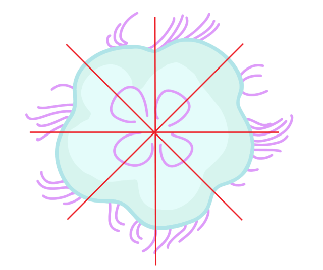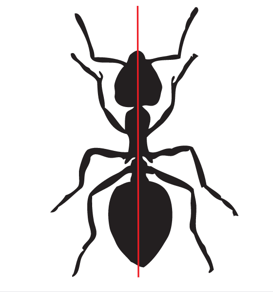Zwróć uwagę, że gdy patrzysz z góry na mrówkę, jej lewa i prawa strona są takie same. Natomiast meduza ma środek symetrii. Zwróć uwagę, że niezależnie na którą oś symetrii spojrzysz, obie strony meduzy są swoim lustrzanym odbiciem.