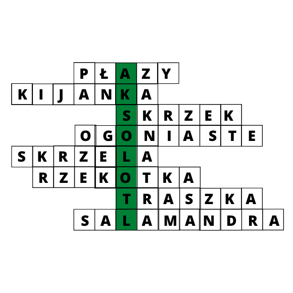 Wpisz odpowiednie litery w kratki, tak aby poziomo można było odczytać wyrazy. Zielona kolumna tworzy hasło.