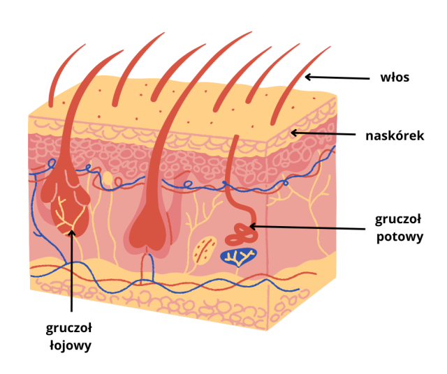 Skóra składa się z trzech warstw: naskórka, skóry właściwej i tkanki podskórnej. Gruczoły znajdują się w skórze właściwej. Gruczoł potowy składa się z cewki wydzielniczej i kanaliku, który odprowadza pot, a gruczoły łojowe mają owalny, pęcherzykowaty kształt.