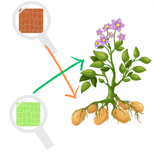 Zastanów się, gdzie znajdują się chloroplasty, a gdzie skrobia. Połącz zdjęcia tkanek z miejscami, w których występują one w roślinie.
