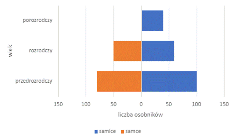 Aby stworzyć piramidę wieku i płci podanej w treści zadania populacji saren musisz ustalić dokładną liczbę samic i samców w odpowiednich zakresach wiekowych. W wieku przedrozrodczym jest 180 osobników, w tym 100 samic co znaczy, że samców jest 80. W wieku rozrodczym jest 110 osobników, z czego 60 stanowią samice co znaczy, że samce stanowią 50. W wieku porozrodczym jest 40 samic. Aby określić czy dana populacja jest populacją wymierającą, ustabilizowaną czy rozwijającą się powinieneś porównać liczbę osobników w poszczególnych grupach. W populacji rozwijającej się liczba osobników młodocianych przewyższa liczbę osobników w pozostałych grupach. W populacji ustabilizowanej ilość osobników jest podobna w poszczególnych grupach (osobników starszych jest najmniej), a w populacji wymierającej liczba osobników w wieku rozrodczym i porozrodczym przewyższa liczbę osobników młodocianych.